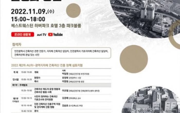 인천광역시(시장 유정복)는 오는 9일 베스트웨스트 하버파크호텔에서 건축공간연구원(원장 이영범)과 공동으로 주최·주관하는 '2022 제2차 AURI-광역지자체 건축자산 진흥 정책 심포지엄'을 개최한다고 6일 밝혔다.이번 심포지엄은 '인천시 건축자산 정책 방향과 활성화 방
