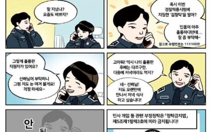 인천광역시 자치경찰위원회는 인천자치경찰의 청렴인식을 정립하고 청렴법령에 대한 이해도를 높이고자 '쉽고 재미있게 보는 청탁금지법'웹툰을 제작했다고 6일 밝혔다.이 웹툰은 경찰의 일상 근무 속에서 혹시 있을지도 모를 '청탁금지법' 위반사례를 위원회에서 자체 제작한 대본을