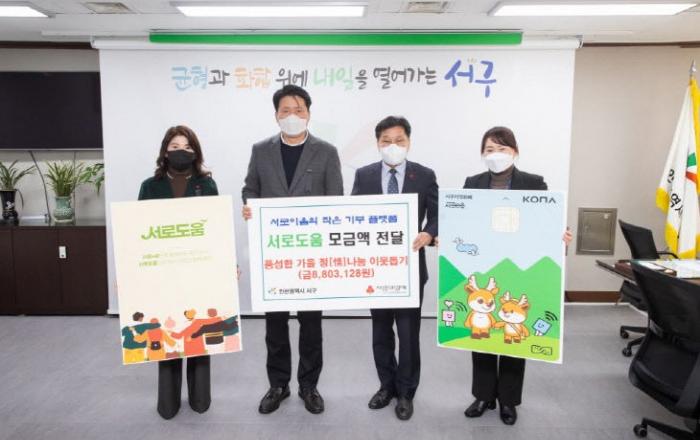 인천시 서구는 7일 지역화폐 '서로e음' 내 기부 프로그램 '서로도움'으로 지난 10월까지 875명이 동참해 880만 원을 모금했다고 밝혔다.구는 서로도움 '풍성한 가을 정 나눔 이웃돕기' 기획사업으로 지난 9월부터 10월 14일까지 지역화폐 앱에서 모금을 운영했다.