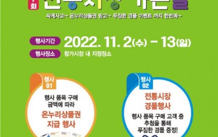 인천광역시(시장 유정복)와 (사)인천상인연합회(회장 이덕재)가 주최하는 제7회 "전통시장 장보러 가는 날"행사가 11월 2일부터 11월 13일까지 개최된다.올해는 전통시장 활성화와 전통시장 이용 고객의 만족을 위해 '2022년 코리아세일페스타'및 가을 김장철 시기에 맞