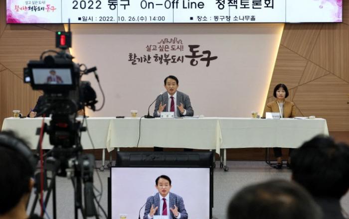 인천시 동구는 지난 26일 소나무홀에서 '2022 동구 온·오프라인 정책토론회'를 개최했다.구는 앞서 21일 메타버스 환경에서 1차 온라인 토론회를 실시, 퍼실리테이터와 40여명의 주민들이 ▲교육·문화 ▲보건·복지 ▲안전·도시·경제 중 각자 희망하는 분야에 참여해 토론