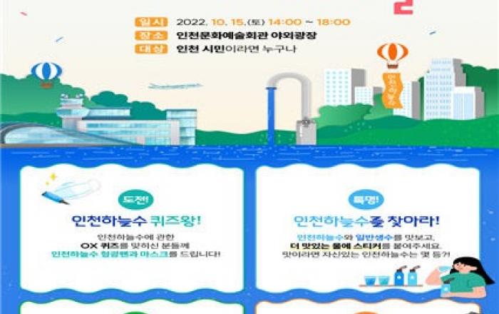 인천시는 수돗물에 대한 시민의 신뢰를 높이고 우수성과 안전성을 홍보하기 위해 오는 15일 인천문화예술회관 야외광장에서 열리는 인천 시민의 날 기념행사에서 홍보캠페인 '인천하늘수 페스티벌'을 펼친다고 13일 밝혔다.이번 캠페인은 인천시에서 생산하는 수돗물 브랜드인 '인천