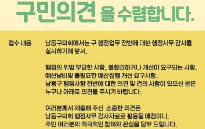 인천시 남동구의회(의장 오용환)가 2022년 행정사무감사를 앞두고 구민들로부터 의견 수렴에 나선다.'행정사무감사'는 의회의 집행부 감시권의 하나로, 남동구의회는 11월 개최 예정인 제283회 제2차 정례회에서 남동구에 대한 행정사무감사를 실시할 예정이다. 이에 앞서 구