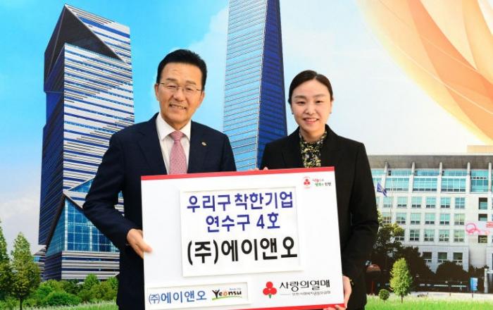 인천시 연수구는 13일 '연수구 착한기업 4호점'로 가입한 ㈜에이앤오에게 '우리구 착한기업' 현판을 전달했다고 밝혔다.'우리구 착한기업'은 매월 30만원 이상 3년간 정기기부를 약정한 중소기업을 대상으로 하는 인천사회복지공동모금회 기부프로그램으로 나눔에 동참 시 기부금