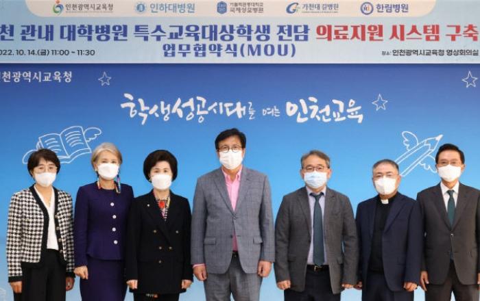 인천시교육청은 14일 특수교육대상 학생의 원활한 병원 이용을 위해 관내 주요 병원과 전담 의료지원 시스템 구축 업무협약을 맺었다고 밝혔다.업무협약에는 ▲인하대병원(의료원장 이 택) ▲가톨릭관동대학교 국제성모병원(병원장 김현수) ▲가천대 길병원(병원장 김우경) ▲인성의료