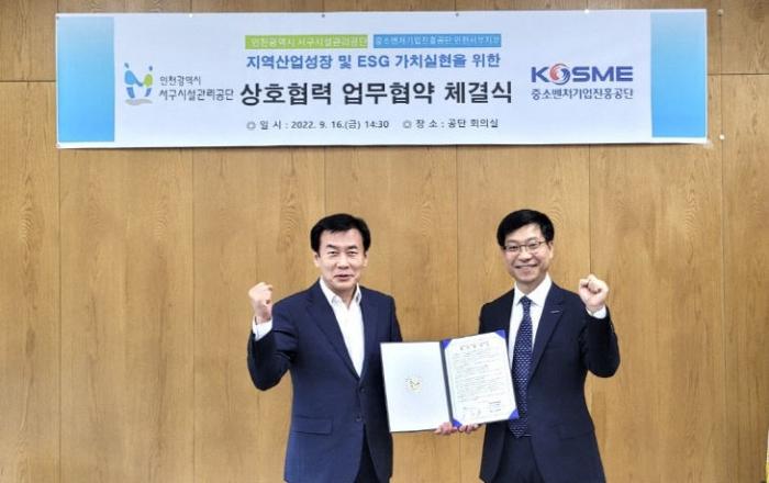 인천시 서구시설관리공단(이사장 구재용)과 중소벤처기업진흥공단 인천서부지부(지부장 김상우)가 16일, 지역산업성장 촉진 및 ESG 가치실현을 위한 상호협력 업무협약을 체결했다.이번 업무협약은 ESG 경영실천과 지역산업성장의 중요성을 인식하고 ESG 가치실현을 위한 상호