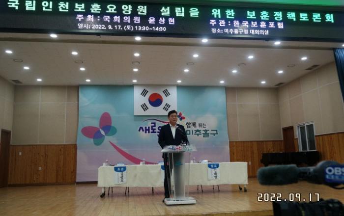 '국립인천보훈요양원 설립'을 위한 보훈정책 토론회가 17일 미추홀구청 대회의실에서 열렸다.토론회에는 이영훈 미추홀구청장, 윤상현 국회의원, 김태열 한국보훈포럼 회장, 김현수 인하대교수(한국보훈포럼 이사), 윤승비 국가보훈처 보훈공단 보훈교육연구원 박사, 김광호 한국보훈