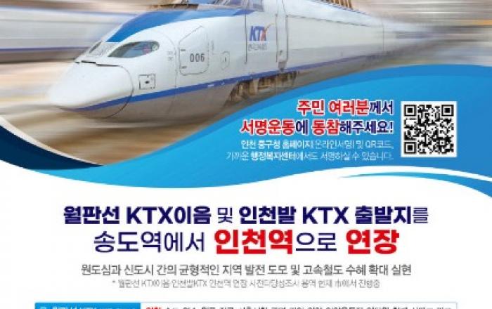 인천시 중구(구청장 김정헌)는 11월까지 3만 명을 목표로 월판선·인천발 KTX 인천역 유치를 위한 범구민 서명운동을 추진한다고 15일 밝혔다.참여는 구청 민원실, 동 행정복지센터에 연명부가 비치되어 서명할 수 있으며 중구청 홈페이지에서도 온라인 서명이 가능하다. 또한