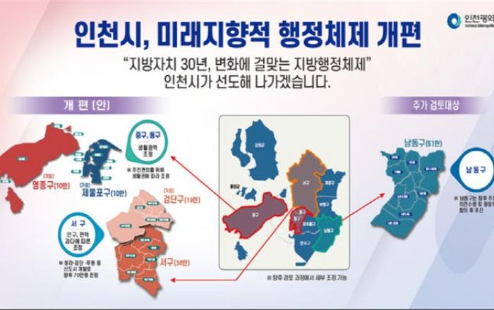 인천광역시가 생활권과 인구 규모에 적합한 미래지향적이고 합리적인 행정구역 개편을 추진한다.인천시는 기존 2군·8구 체제에서 2군·9구 체제로 전환을 추진한다고 31일 밝혔다.시에 따르면 현행 체제는 1995년도 2군·8구로 확정된 이후, 27년 동안 행정적, 사회적 여