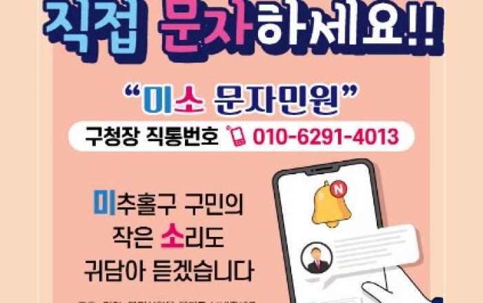 인천시 미추홀구는 9월 1일부터 인천시 최초 구청장 직통 문자민원 서비스 '미소 문자민원'을 운영한다고 밝혔다.미소 문자민원은 '미추홀구 구민의 작은 소리도 귀담아 듣겠습니다' 줄임말로 이영훈 미추홀구청장이 직접 구민들로부터 불편과 고충, 건의사항 등 민원사항을 신속하