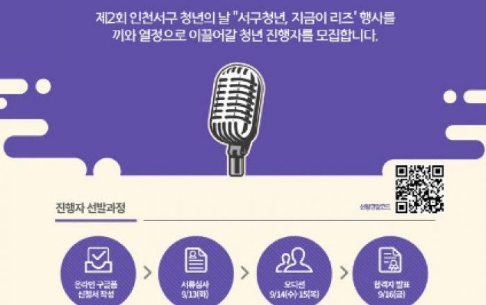 인천시 서구(구청장 강범석)는 오는 24일 개최되는 청년센터 개관식에서 '서구청년, 지금이 리즈' 행사를 진행할 '청년 진행자'를 공개 모집한다고 1일 밝혔다.9월 청년의 날 기념으로 열리는 '청년의 날 행사'는 지역 청년들이 직접 기획, 운영할 뿐만 아니라 청년들의
