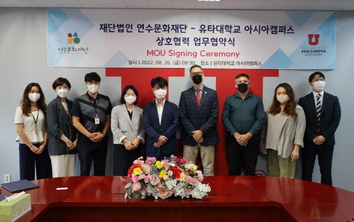 유타대학교 아시아캠퍼스는 26일 인천 송도 글로벌캠퍼스에서 연수문화재단과 인천 지역 문화예술 진흥을 위한 업무협약을 체결했다고 밝혔다.협약식에는 그레고리 힐 유타대 아시아캠퍼스 대표와 임철빈 연수문화재단 대표이사 등 양측 관계자 10여 명이 참석했다.유타대 아시아캠퍼스