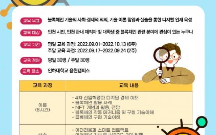 인하대학교(총장 조명우)가 '블록체인 전문인력(기초과정) 양성교육' 수강생을 모집한다고 20일 밝혔다.인하대는 인천시 및 인천테크노파크와 함께 블록체인 관련 산업을 활성화하고, 인천의 지역기업에서 필요한 실무 중심의 블록체인 분야 전문인력을 양성하기 위해 올해 처음 블