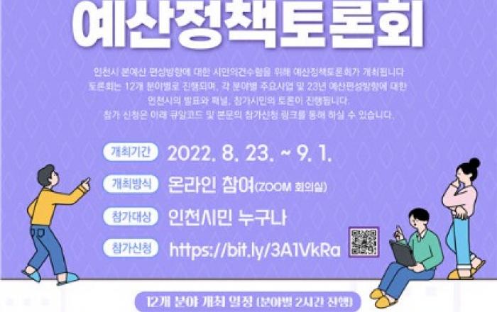 인천시(시장 유정복)는 민선8기 시정목표와 공약추진 등 주요 정책을 시민과 소통·공감하고자 23일부터 내달 1일까지 온라인예산정책토론회를 개최한다고 22일 밝혔다.이번 토론회는 인천주민참여예산 12개 분과위원회 소관 실국에서 주최하고 주민참여예산위원회와 참여예산지원센터