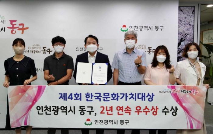 인천시 동구는 (사)한국문화가치연구협회(이사장 김명곤)에서 주관하는 '제4회 한국문화가치대상'에서 지난해에 이어 '우수상'을 수상했다고 22일 밝혔다.한국문화가치대상은 전국 지방자치단체에서 추진해온 특색있는 문화정책의 사업성과를 점검하고 평가하여 한국 문화가치의 경쟁력
