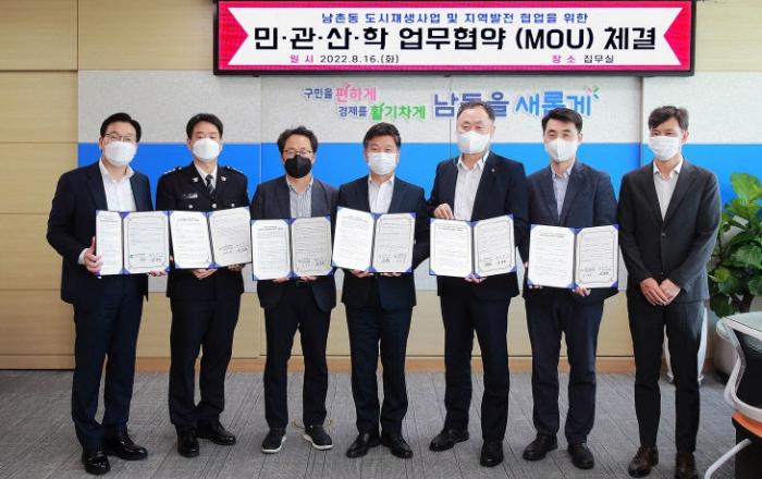 인천시 남동구는 지난 16일 민·관·산·학 5개 기관과 남촌동 일원 도시재생사업 추진을 위한 업무협약을 체결했다고 17일 밝혔다.협약에 참여한 기관은 포스코건설, 한국산업단지공단 인천지역본부, 인천논현경찰서, 남촌농축산물도매시장, 인하대학교 5곳이다.이번 업무협약은 남