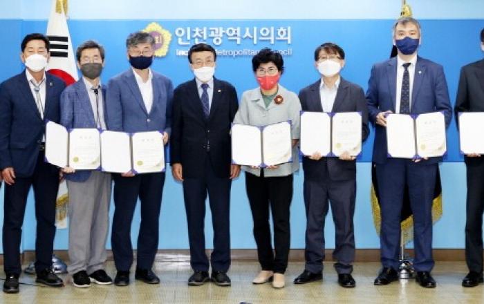 인천광역시의회(의장 허식)는 9일 의장접견실에서 허식 의장을 비롯해 이봉락 제1부의장, 변주영 의회사무처장 등이 참석한 가운데 ‘인천광역시의회 입법·법률고문에 대한 위촉장 수여식’을 개최했다. 이번에 위촉된 입법고문에는 최민수 제윤의정 지방의정연구소장, 김영진 인천대