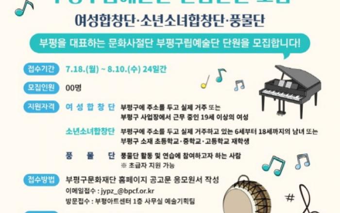 부평구문화재단(대표이사 이영훈)은 부평 문화사절단으로 활동할 부평구립예술단 신입 단원을 오는 8월 10일(수)까지 모집한다.모집분야는 여성합창단, 소년소녀합창단, 풍물단이다. 여성합창단은 부평구에 거주하거나 부평구 소재 직장에 다니고 있는 만 19세 이상 여성, 소년소