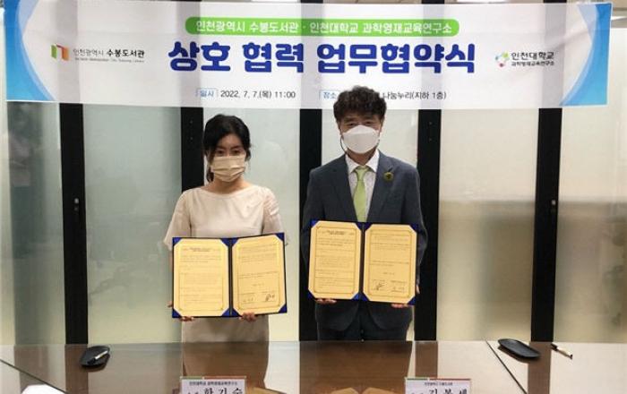 인천시가 설립하고 인천시도서관발전진흥원이 운영하는 수봉도서관이 7일 인천대학교 과학영재교육연구소와 산학 협력체계 구축과 지식·정보·인적 교류, 상호 지원을 통한 공공 서비스를 강화하기 위한 업무협약을 체결했다.수봉도서관 지하 1층 나눔누리에서 열린 협약식에는 김봉세 수