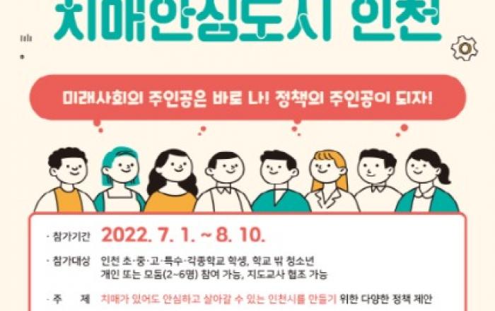 인천광역시는 "전 세대가 동참하는 치매안심도시를 조성하고자 ‘청소년 대상 치매정책 제안대회’를 개최한다"고 밝혔다.이번 대회는 미래사회의 주인공인 청소년들과 함께 치매안심도시 청소년들이 치매에 대한 고민을 함께함으로써 치매에 대한 인식을 개선하고자 기획됐다.또 제안 주