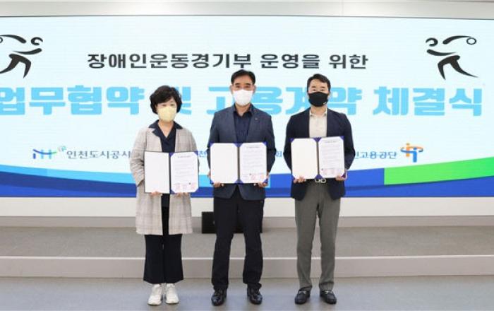 인천도시공사(iH)가 지난 30일 인천장애인체육회 및 장애인고용공단과 '장애인 직장운동경기부 활성화 업무협약'을 체결했다.협약식에는 iH 기획조정실장, 인천시장애인체육회 사무처장, 장애인고용공단 취업지원부장, 인천혜광학교 관계자가 참석했다.이번 업무협약을 통해 iH는