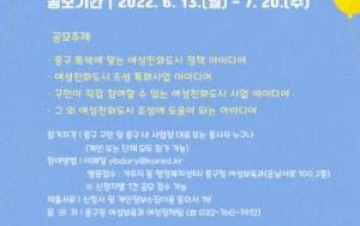 인천시 중구(구청장 홍인성)는 여성친화도시에 대한 구민의 관심을 높이기 위해 '여성친화 존 홀씨뿌리기' 여성친화도시 정책 아이디어 공모전을 실시한다.공모주제는 ▲인천 중구 특색에 맞는 여성친화도시 정책 아이디어 ▲여성친화도시 조성 특화사업 아이디어 ▲구민이 직접 참여할