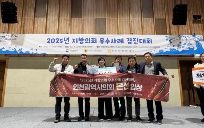 ▲ 인천시의회,전국 지방의회 우수사례 경진대회서 우수상 수상(인천시의회 제공)인천시의회가 최근 울산시 전시컨벤션센터에서 열린 행정안전부 주관 ‘2025년 지방의회 우수사례 경진대회’에서 우수상을 수상했다고 24일 밝혔다.이번 경진대회는 전국 100여 개 넘는