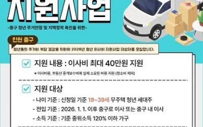 인천시 중구는 청년들의 주거 안정을 돕기 위해 ‘2026년도 청년 이사비 지원사업’을 추진한다고 26일 밝혔다.‘청년 이사비 지원사업’은 경기침체 장기화, 물가 상승, 청년 고용난 등으로 어려움을 겪는 무주택 청년들의 주거비용 부담을 완화하고자 인천 중구가 지난 202