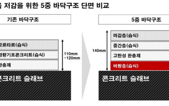 GS건설이 아파트 층간소음을 획기적으로 줄이기 위해 국내 최초로 ‘5중 바닥 구조’를 개발했다. GS건설은 1월 이미 층간소음 1등급 성적서를 받은 바닥구조를 개발한 바 있다. 5중 바닥 구조는 이를 보강해 층간소음 저감 효과를 더욱 높이고, 대규모 현장 시공이 가능한