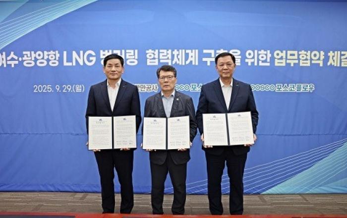 ▲ 협약식에 참석한 민창기 포스코인터내셔널 에너지사업본부장, 홍상표 여수광양항만공사 운영부사장, 김종필 포스코플로우 원료물류실장.포스코인터내셔널은 지난 29일 포스코플로우, 여수광양항만공사와 함께 ‘여수광양항 LNG 벙커링 협력체계 구축 업무협약’을 체결했다.