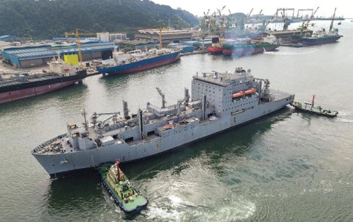 ▲ 정기 정비를 위해 울산 HD현대미포 인근 염포부두에 입항 중인 미 해군 소속 4만1000톤급 화물 보급함 ‘USNS 앨런 셰퍼드 함’HD현대중공업이 미국 해군의 군수지원함 유지·보수·정비(MRO) 사업에 본격 착수했다.HD현대중공업은 최근 미 해군 7함대