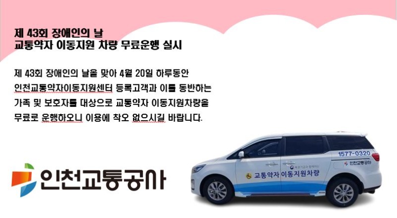 인천교통공사 김성완 사장은 오는 20일“제43회 장애인의 날”을 맞이하여 교통약자 이동지원 차량 무료운행 서비스를 한다고 밝혔다.