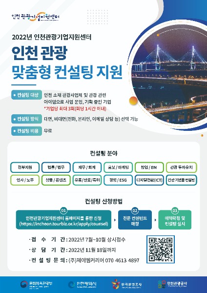 컨설팅 신청 및 자세한 사항은 인천관광공사 관광기업지원센터 홈페이지(https://incheon.tourbiz.or.kr/) 공지사항을 통해 확인할 수 있다.