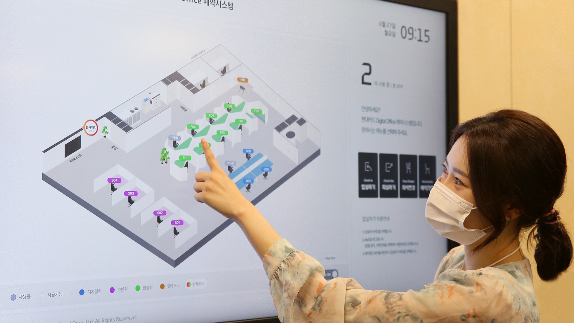 ‘디지털 오피스 강남’은 현대카드 임직원이라면 누구나 인트라넷 및 모바일을 통해 신청하고 자유롭게 이용할 수 있다. 이용 절차 또한 간편하다. 이용 당일 사무실 입구에 설치된 무인단말기(키오스크, kiosk)에 마이디(사원증) 인증을 하면 예약된 좌석과 사물함에 디지털 명패 정보가 자동으로 반영된다. 퇴근 시엔 동일하게 무인단말기에 사원증을 태그 하면 모든 이용 절차가 종료된다.