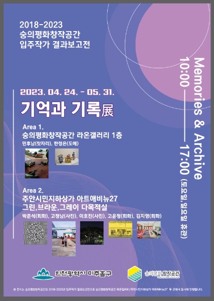 인천 미추홀구 이영훈 구청장은 24일부터 다음 달 31일까지 숭의평화창작공간 라온갤러리, 주안시민지하상가 아트애비뉴27에서 숭의평화창작공간 입주작가 결과 보고전 ‘기억과 기록’展을 개최한다고 밝혔다.