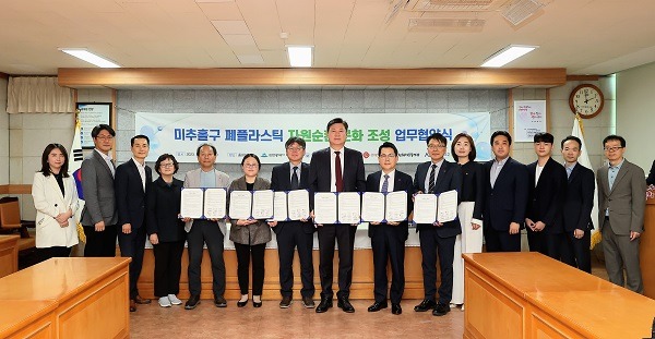 인천 미추홀구는 3일 인하대학교, 롯데알미늄, 롯데케미칼, 인천환경운동연합, AO2와 함께 미추홀구 폐플라스틱 자원순환 문화 조성을 위한 업무협약을 체결했다고 밝혔다.