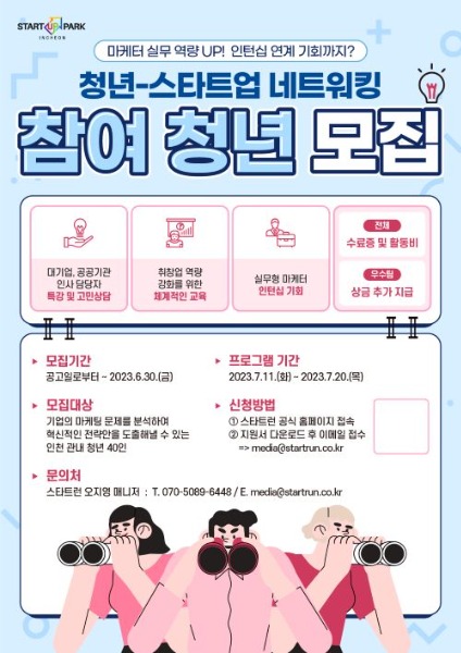현재 인천에 거주하는 만 39세 이하의 청년은 누구나 신청이 가능하다. 참여 청년들에게는 소정의 활동비가 지원되며 최종 프리젠테이션(PT)에서 선정된 우수팀에 대해서는 상금도 지급한다. 또 이번 프로그램에 참여하는 스타트업에서 실무형 마케터로서 인턴십 기회가 주어진다.