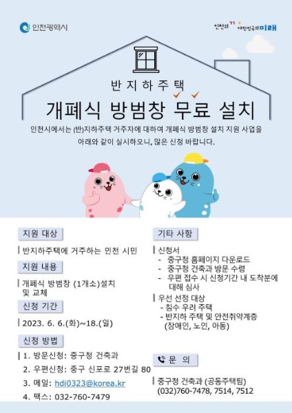 이 사업은 지난 3월 인천시가 발표한 ‘반지하주택 침수피해 대책’의 일환이다. 반지하주택 침수 시 수압으로 현관문을 열 수 없는 경우, 창문으로 신속히 탈출할 수 있도록 개폐가 가능한 방범창 설치를 지원하는 것이 골자다.