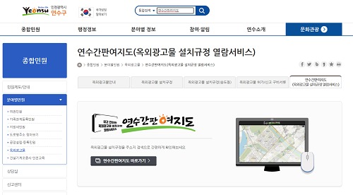 연수구는 이달부터 복잡한 옥외광고물 설치규정을 주소지 검색만으로 누구나 쉽고 간편하게 확인할 수 있는 GIS 기반 검색시스템 ‘연수간판여지도’ 서비스를 인천시 최초로 시행한다.