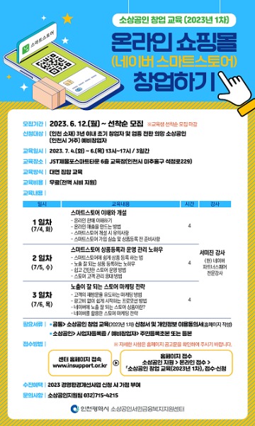 교육 신청·접수는 6월 12일부터 선착순으로 모집하며, 신청을 원하는 소상공인 및 예비창업자는 인천시 소상공인서민금융복지지원센터 홈페이지에서 신청 또는 전화(032-715-4215)로 확인할 수 있다.