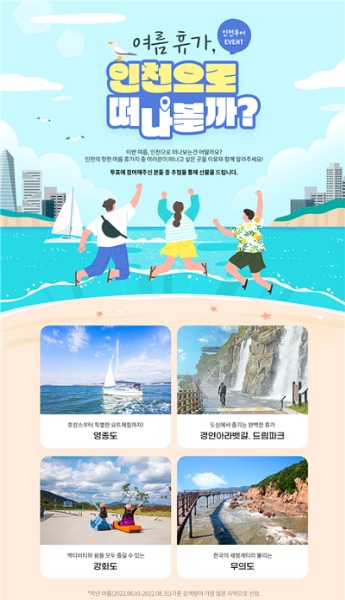 ‘인천의 여름 휴가지 중 가장 떠나고 싶은 장소는’ 이라는 주제로 진행되는 이번 온라인 이벤트는 인천의 여러 관광지 중 2022년 하계 휴가철 인천투어 홈페이지에서 많은 검색량을 차지한 4곳 중 한 곳을 선택하는 것이다.