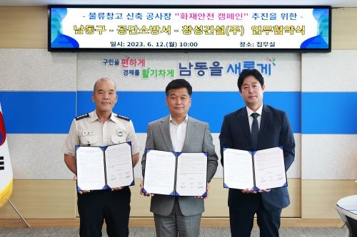 남동구는 12일 구청장 집무실에서 공단소방서 및 창성건설(주)와 물류창고 화재 예방을 위한 업무협약을 맺었다고 밝혔다. 또 협약식에는 박종효 남동구청장과 박태선 공단소방서장, 창성건설(주) 김학수 건설사업본부장 등이 참석했다.