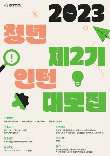 인천 서구가 미취업 청년의 역량 강화와 취업을 위한 '2023년 제2기 취업성공 디딤돌 청년인턴 사업'을 추진하고 오는 29일까지 참가자를 모집한다고 밝혔다.