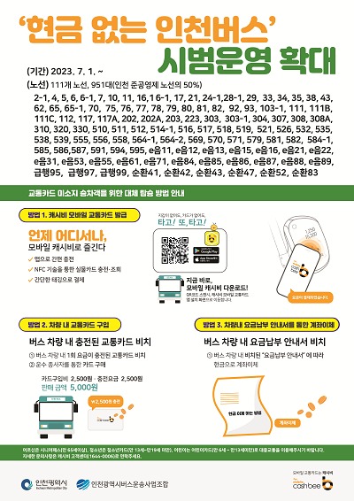 인천시는 시민홍보와 불편 사항 사전 모니터링을 위해 지난해 1월부터 시범운영 중인 ‘현금 없는 인천버스’를 7월부터 34개 업체, 111개 노선, 951대로 확대한다. 이는 인천시 준공영제 노선의 50%에 해당한다.