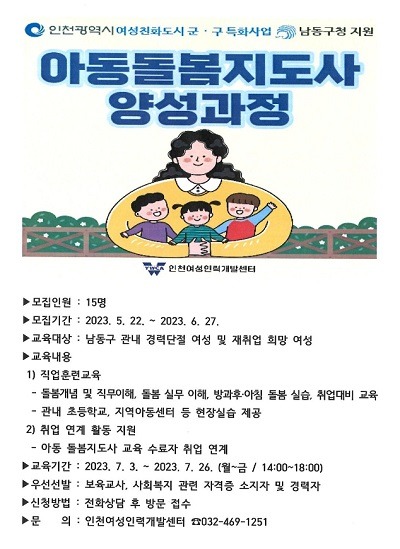 인천시 남동구는 지역 내 경력단절 및 재취업 희망 여성들을 대상으로 ‘아동 돌봄지도사 양성과정’을 운영한다고 20일 밝혔다.