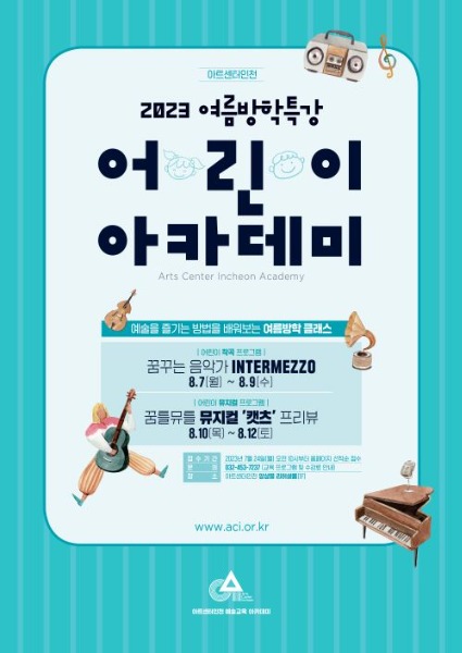 이번 특강은 오전, 오후 각 3일씩 일주일간 4개의 강좌가 진행되며 대상은 초등학교 2학년부터 6학년가지 강좌에 맞게 진행된다. 강좌신청은 7월 24일(월) 10시부터 아트센터인천 홈페이지(aci.or.kr)에서 선착순 접수로 수강 신청이 가능하다.