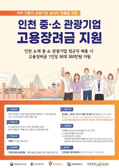 인천광역시와 인천관광공사는 인천 중소 규모 전통적 관광기업들의 고용 활성화를 지원하는 ‘2023 인천 중·소 관광기업 고용지원 사업’을 진행한다고 밝혔다.