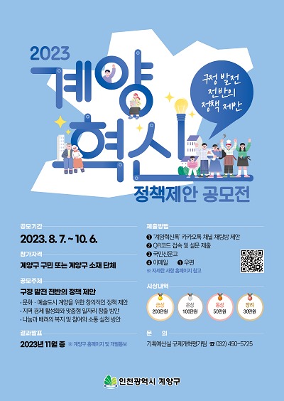 인천광역시 계양구(구청장 윤환)는 구민의 창의적인 정책 제안을 발굴하여 구정에 적극 반영하고자 “2023년 계양 혁신정책 제안 공모전”을 실시한다.