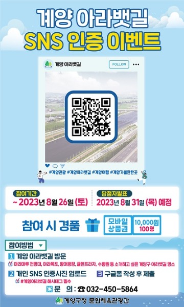 계양 아라뱃길을 찾는 방문객 누구나 참여할 수 있으며, 참여 기간은 8월 26일까지이다. 계양구는 참여자 중 100명을 추첨해 1만 원 상당의 모바일 상품권을 증정할 계획이며, 당첨자 발표는 8월 31일 목요일 예정이다.