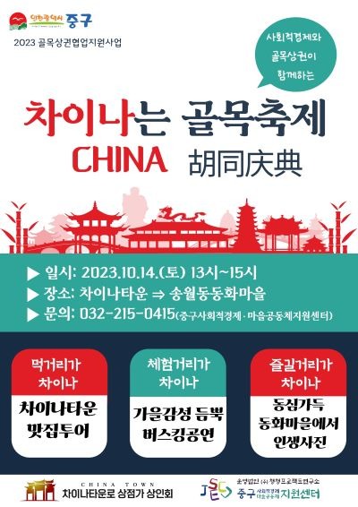 인천 중구 사회적경제·마을공동체 지원센터(센터장 김지영)는 오는 14일 오후 1시부터 차이나타운과 동화마을 일대에서 ‘사회적경제와 골목상권이 함께하는 「차이나는 골목축제」’ 행사를 개최한다고 밝혔다.